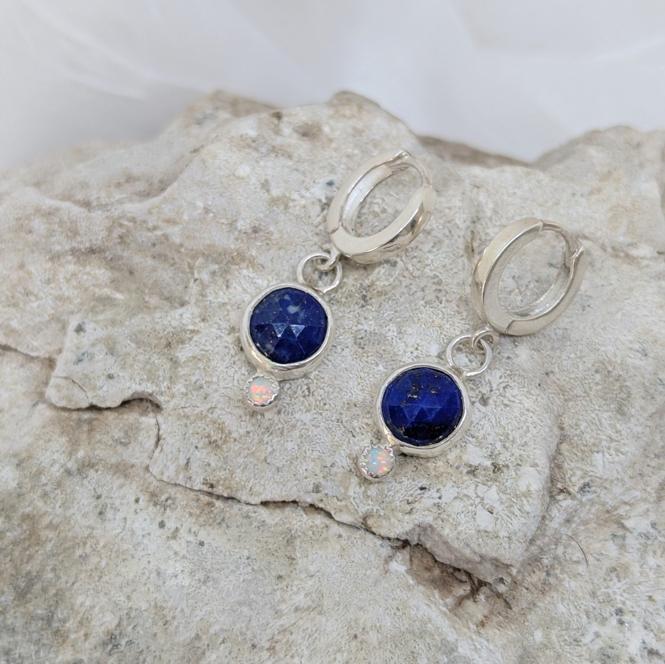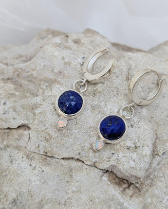 Introducing our dainty and versatile small huggie earrings with lapis and opal! Perfect for everyday wear, these huggies add a subtle pop of color to any outfit. With their delicate size, you can rock them all day and night with ease. Spice up your earring game with these beauties!