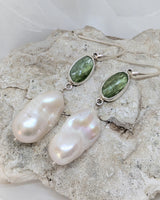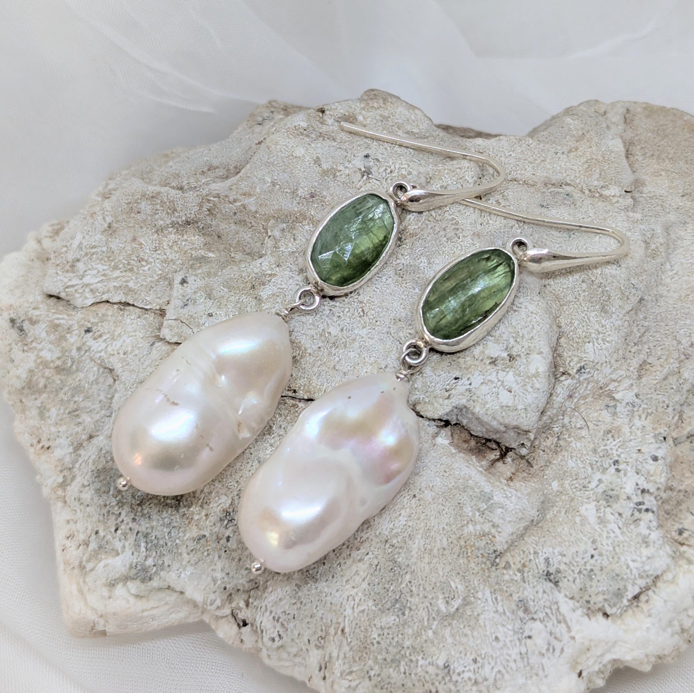 Sue earrings capture effortless elegance with luminous baroque pearls and striking green kyanite. These statement pieces blend organic texture with refined gemstone beauty—perfect for adding a touch of understated luxury to any occasion. Timeless, chic, and wonderfully wearable.