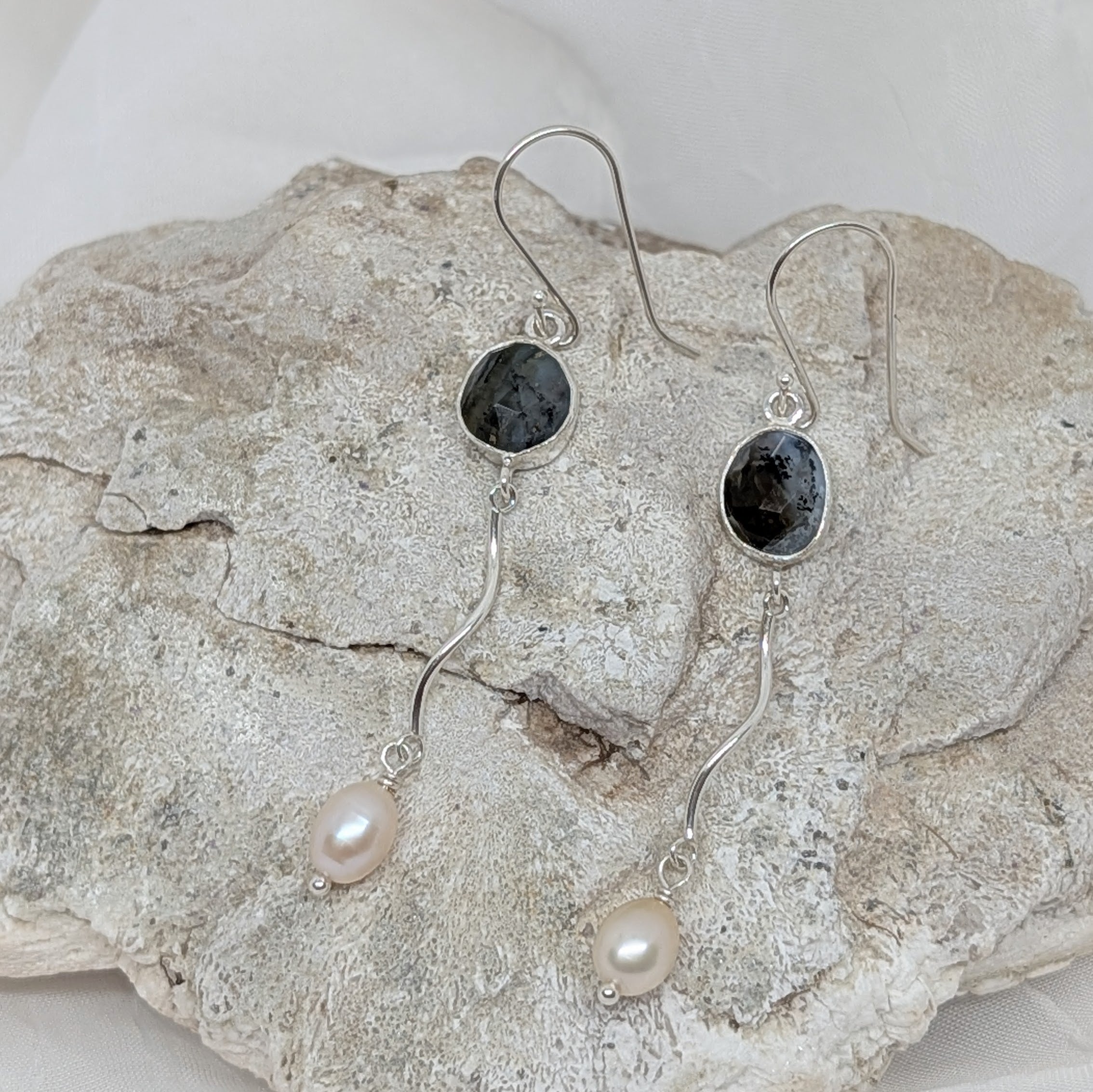 Peruvian opal meets flowing silver in these captivating drop earrings, where delicate pearls add luminous charm. The wavy silver design creates graceful movement with every turn of your head, catching light beautifully. Perfect for those seeking an elegant yet playful accessory, these earrings bring sophistication and dynamic flair to any occasion. The gentle sway of the dangles ensures you'll love the way they move.