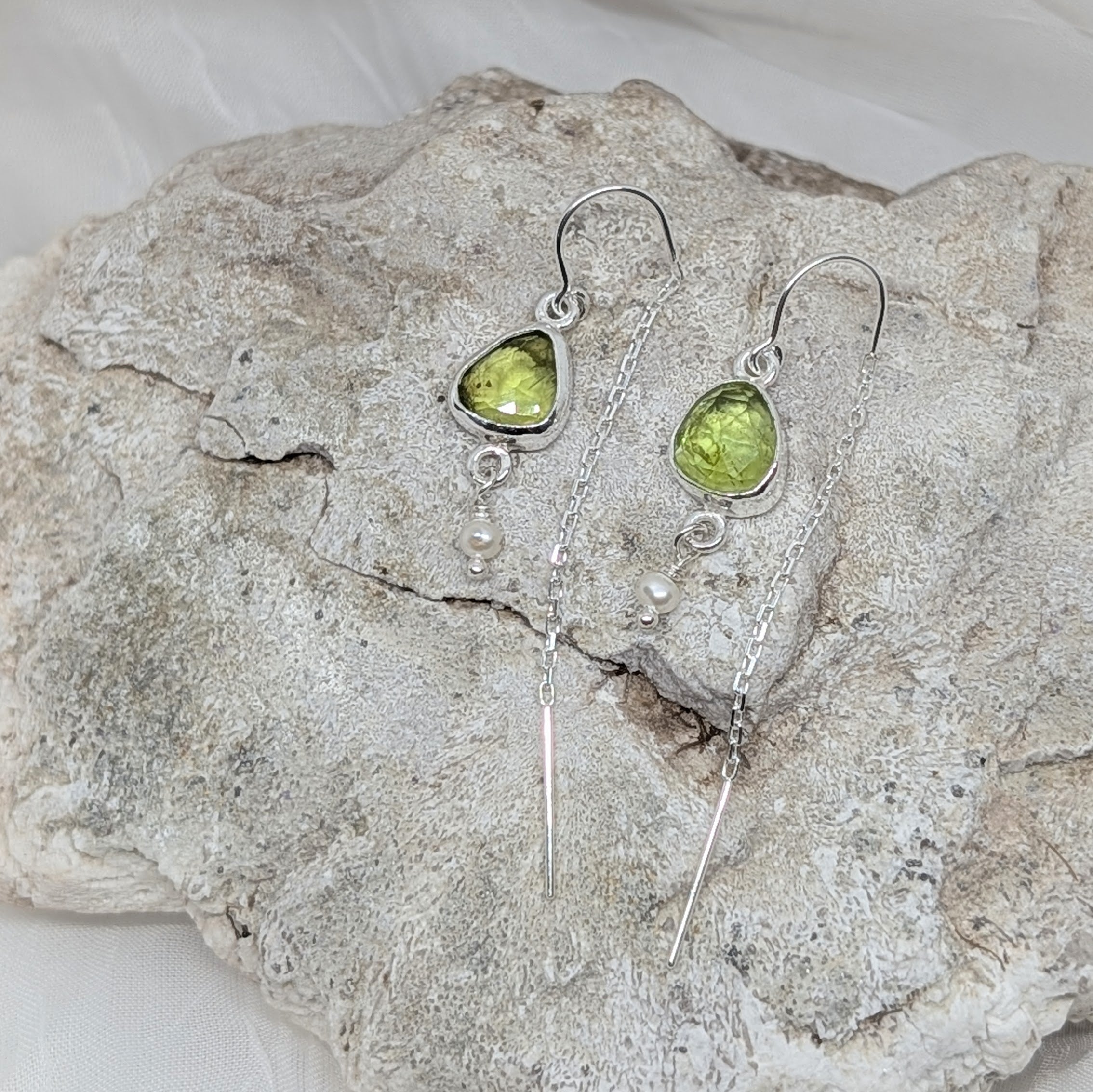 Radiant peridot stones catch the light with their vibrant green glow, suspended from delicate sterling silver chains that frame your face beautifully. Each earring features a lustrous pearl accent, adding a touch of classic elegance to the playful sparkle of the peridot. Perfect for anyone who loves a pop of color with a hint of sophistication—wear them for everyday joy or dress them up for special occasions. The combination of fresh green and creamy pearl creates a look that's both fun and effortlessly chic.