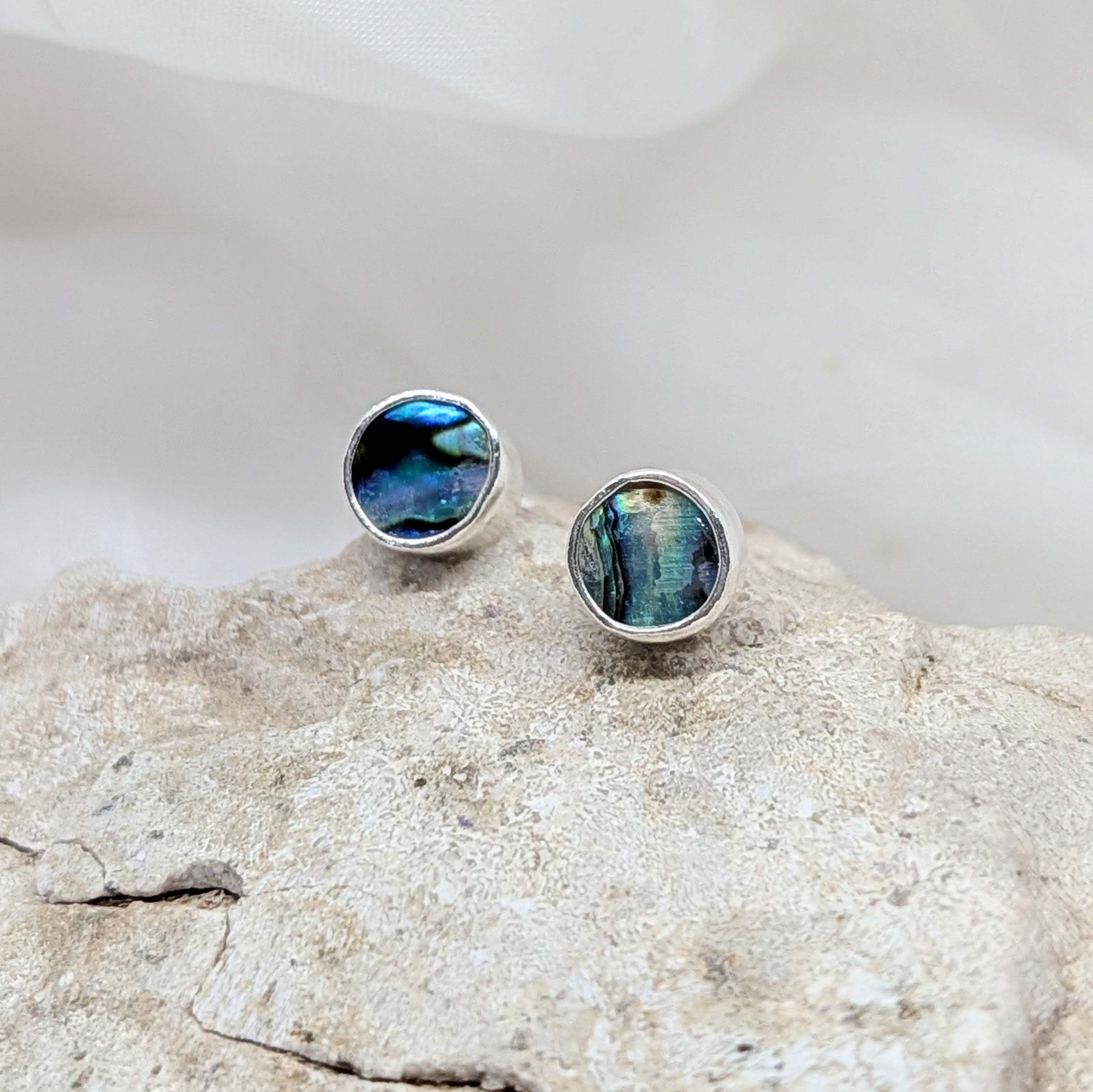 Genuine abalone shell studs in sterling silver with iridescent blue, green, and purple hues. Lightweight and comfortable for everyday wear, perfect for summer and beach lovers.