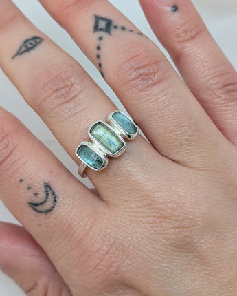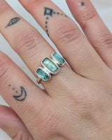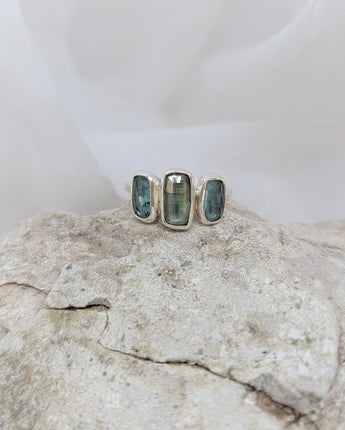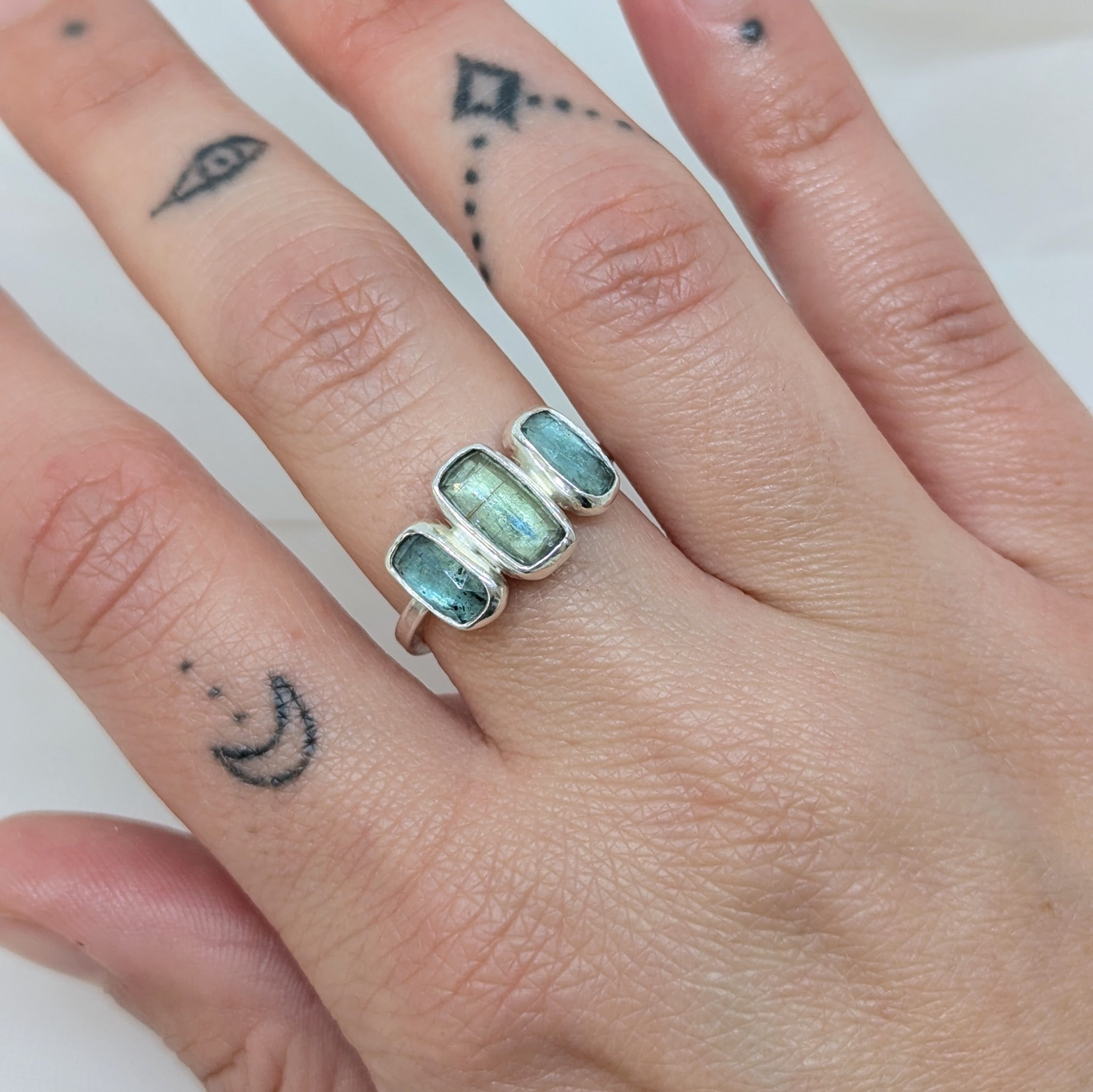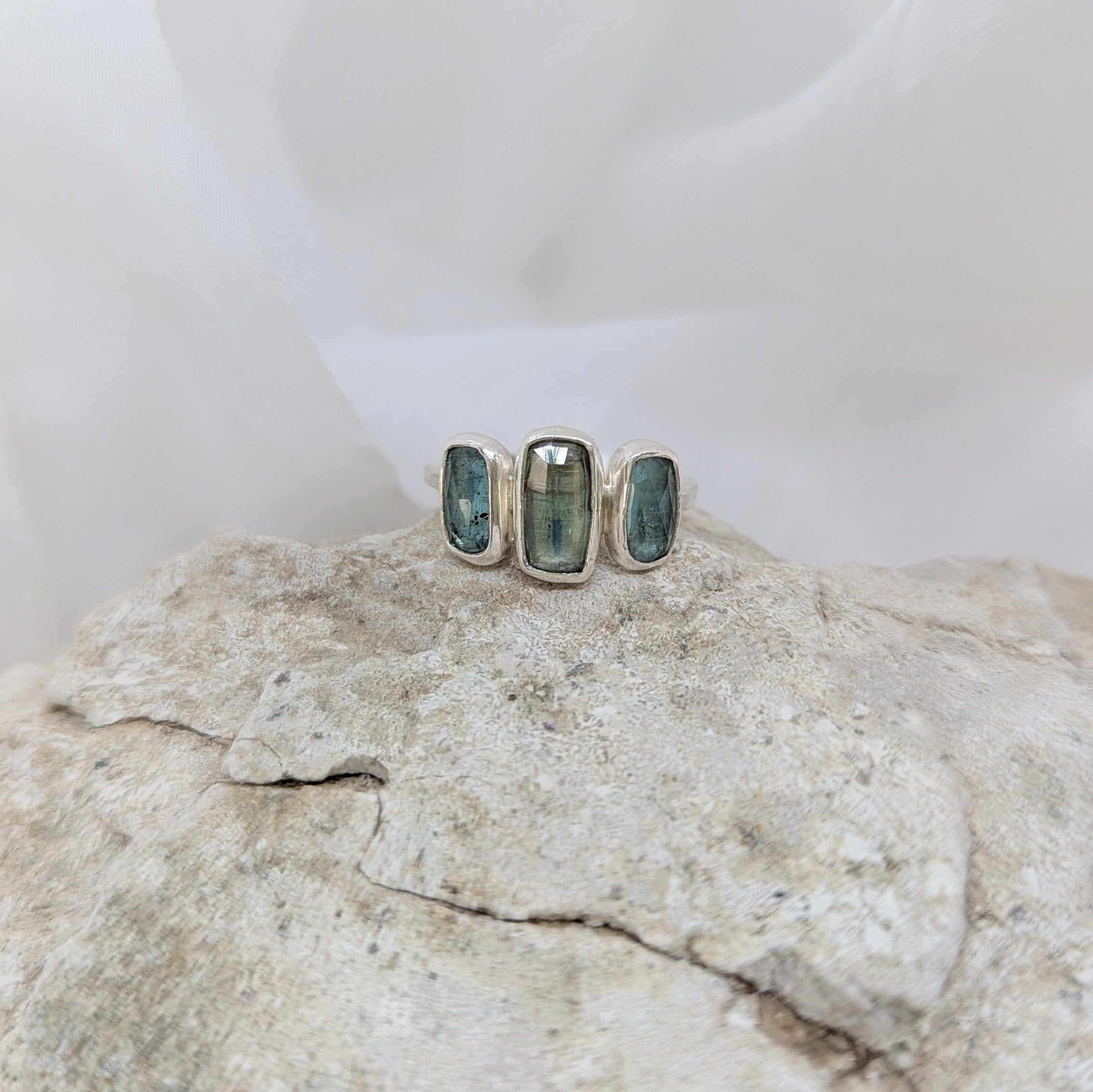 Three radiant green kyanite stones steal the spotlight in this playful design that refuses to blend in. The side-by-side arrangement delivers serious glamour without taking itself too seriously—perfect for someone who wants to sparkle from sunrise to sunset. Wear it casually on a Monday or dress it up for Saturday night; this ring adapts to your mood.