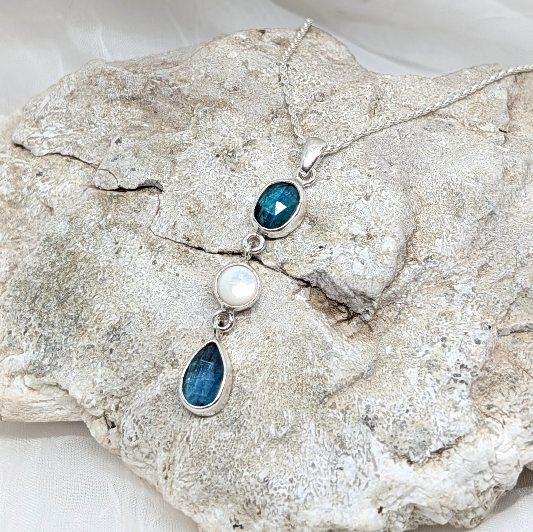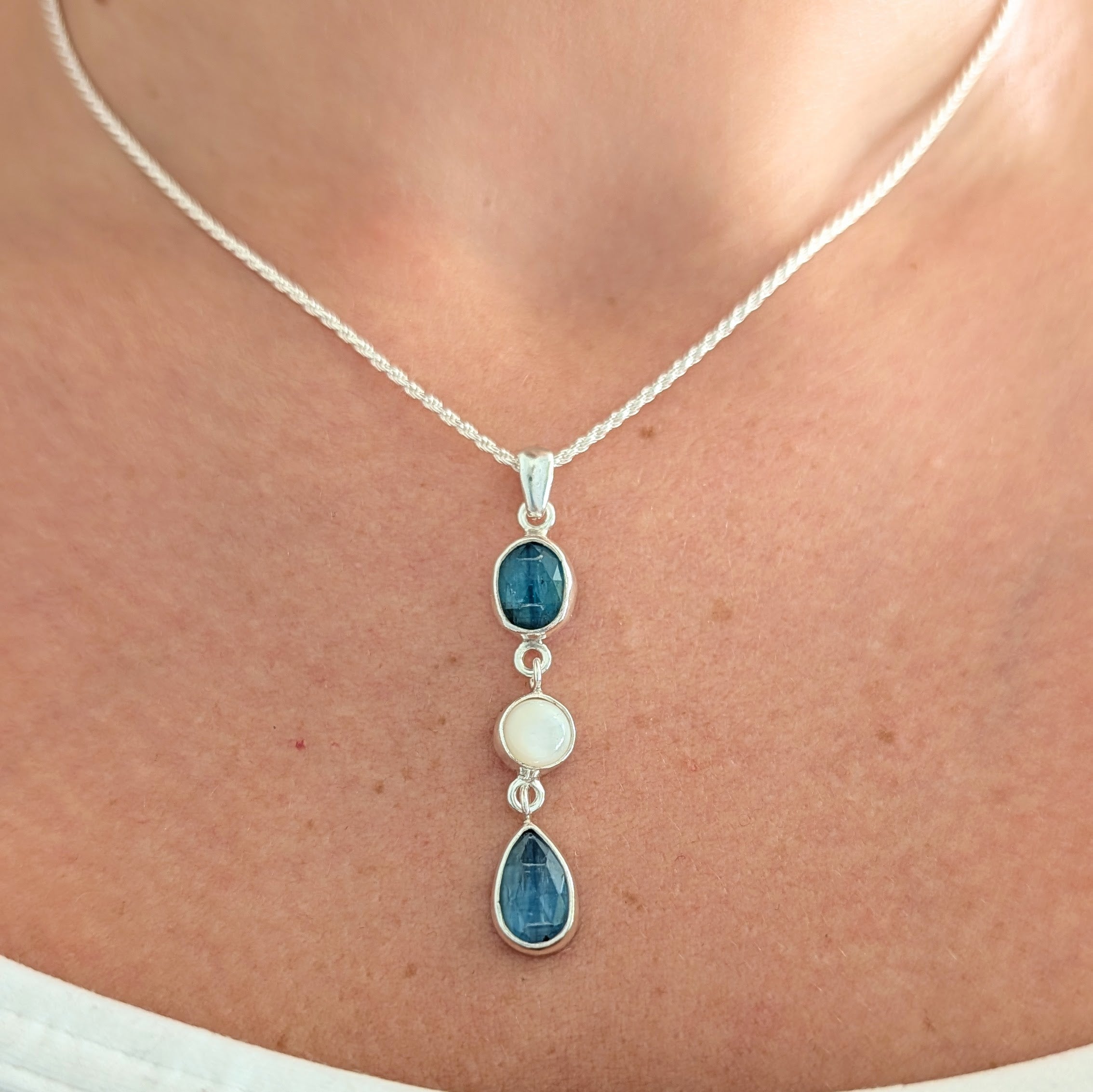 Coastal Mist Necklace features three luminous stones cascading delicately down your neckline. Blue kyanite and shimmering mother of pearl stones dangle gracefully from one another, creating an ethereal, layered effect. Each stone catches the light with a subtle sparkle, perfect for adding understated elegance to any look. This dainty piece brings the serene beauty of the ocean to your everyday style.
