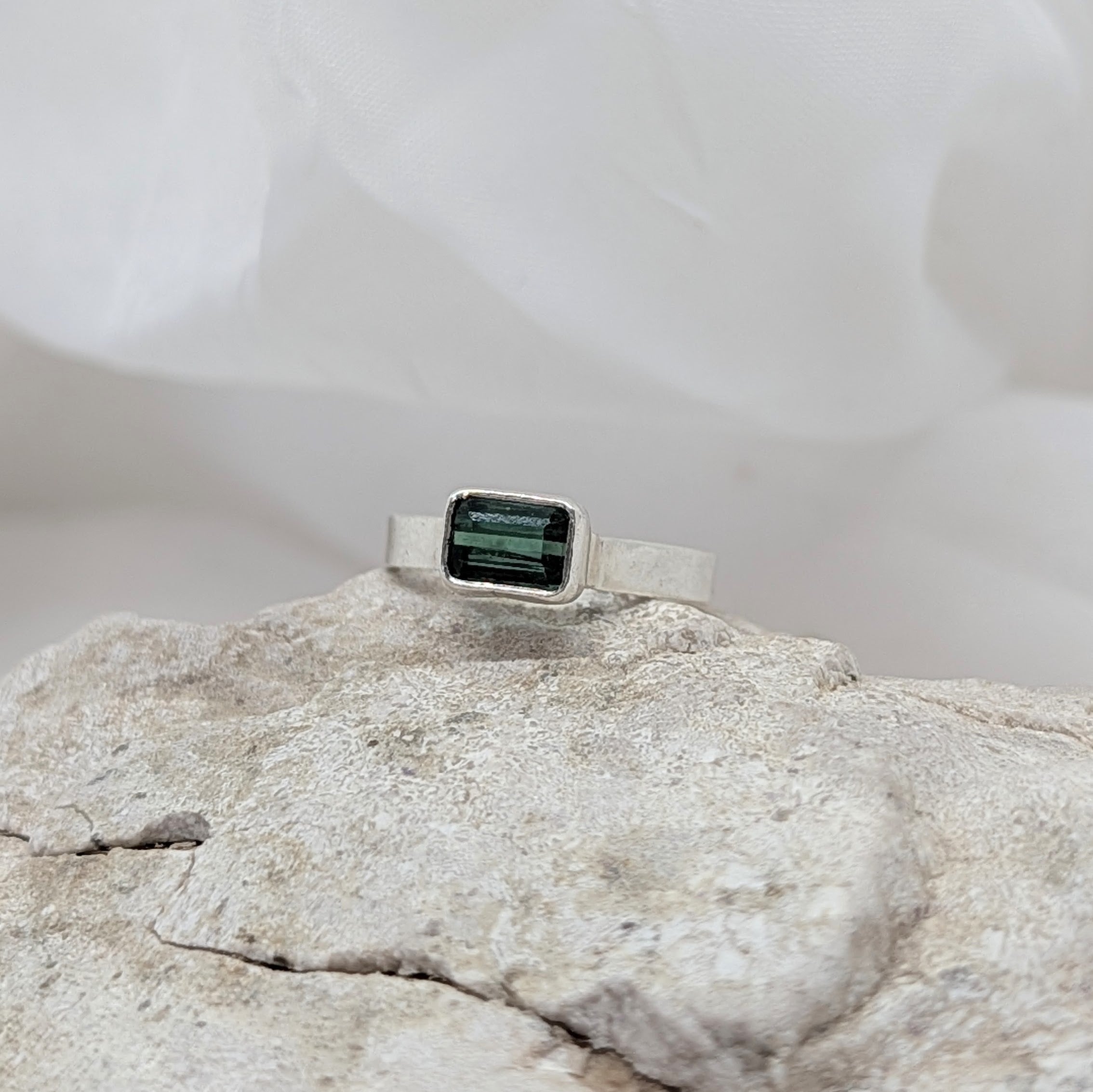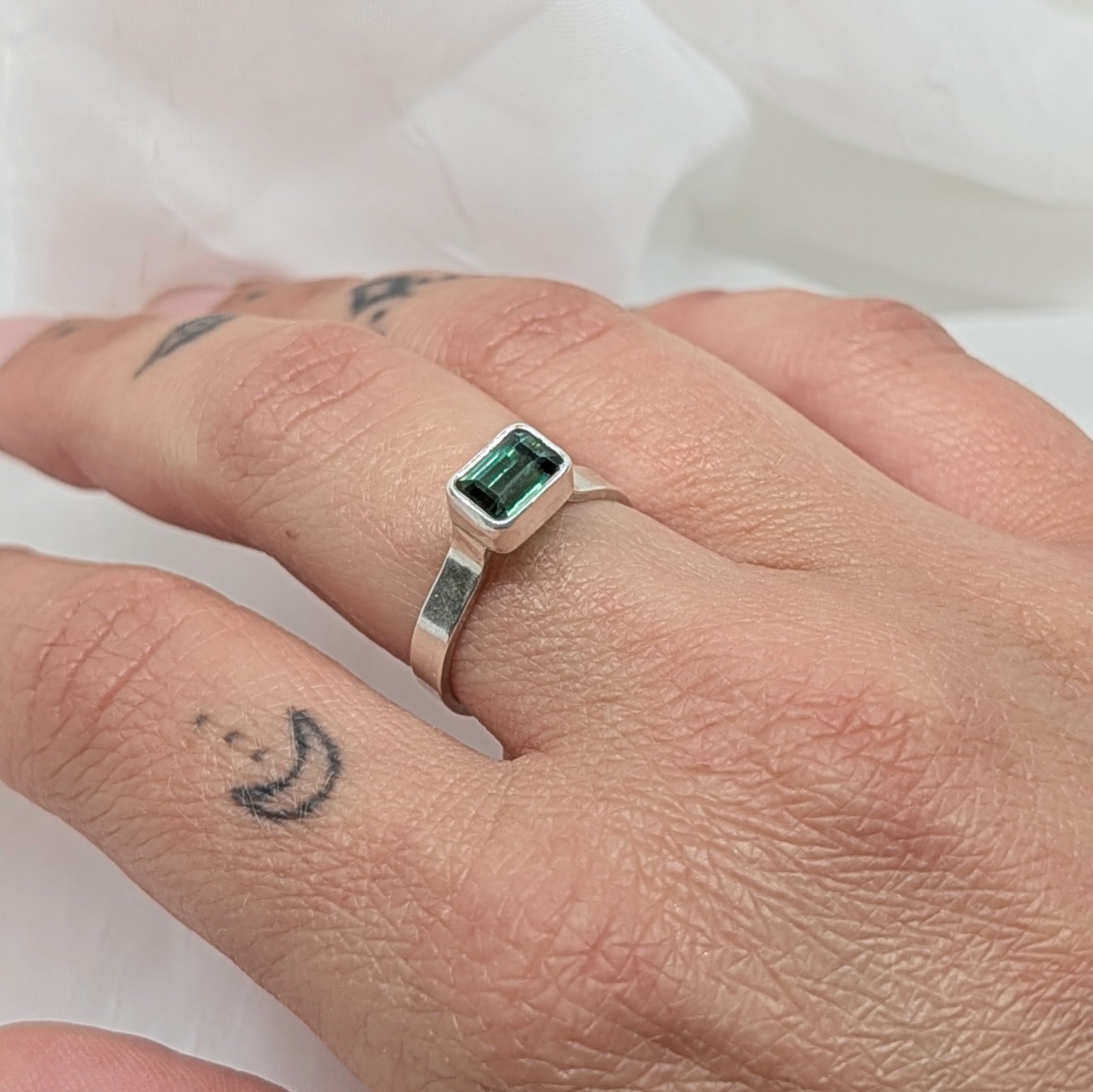 A striking statement piece featuring a deep green tourmaline stone set in sterling silver. The rectangular gemstone sits elevated on the finger, creating an elegant silhouette that catches the light beautifully. The rich forest-green hue of the tourmaline contrasts gorgeously against the bright polish of sterling silver, making this ring perfect for everyday wear or special occasions. A timeless design that brings natural beauty and sophistication to any hand.