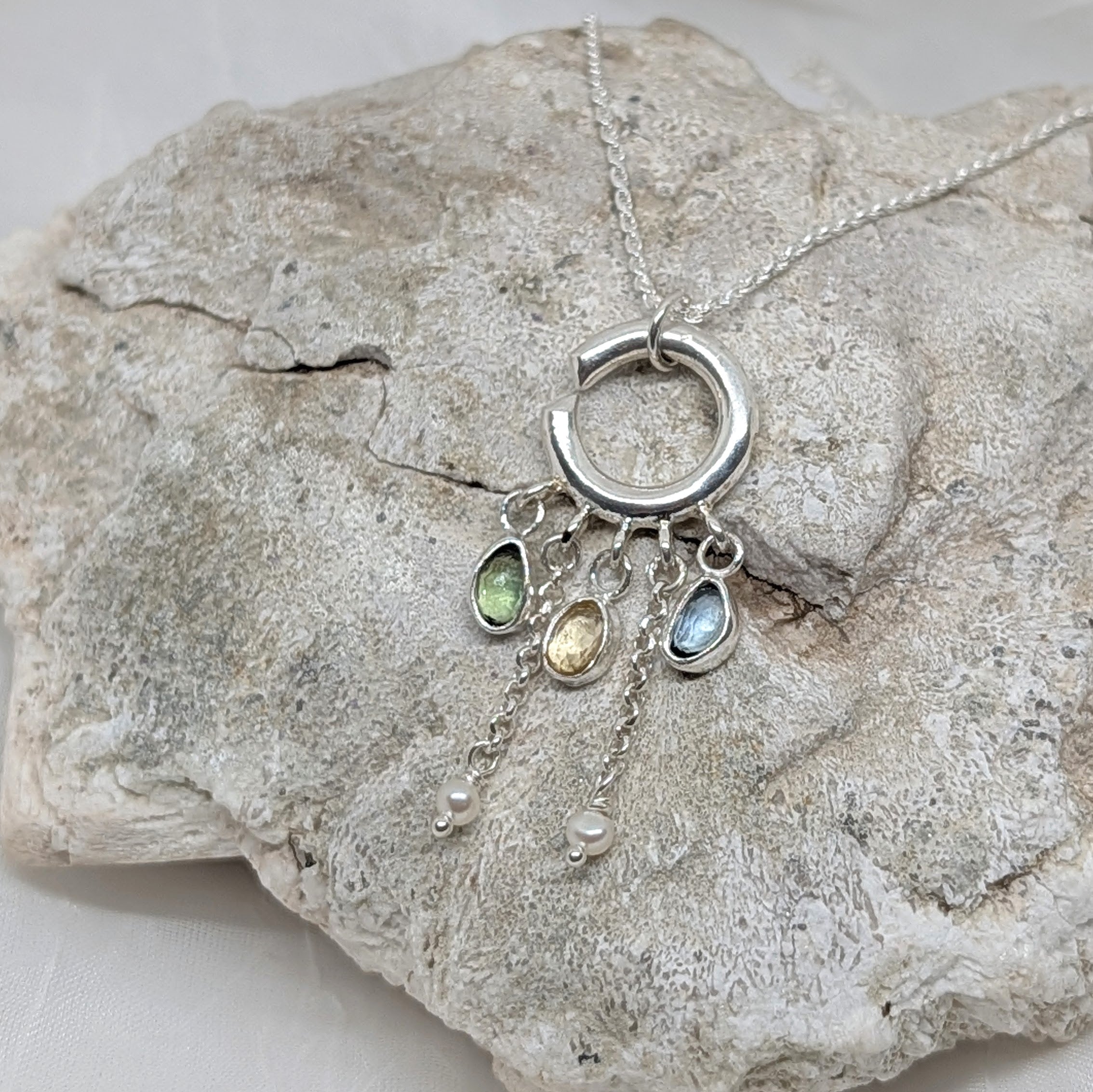 Capture summer magic with this whimsical Dream Catcher necklace. A delicate silver hoop frames the design, adorned with three vibrant sapphires in blue, yellow, and green that cascade gracefully downward. Lustrous pearls complete the piece, adding timeless elegance to the playful color palette. Perfect for those who embrace bold, unique style with a carefree spirit. A conversation starter that brings joy and individuality to any outfit.