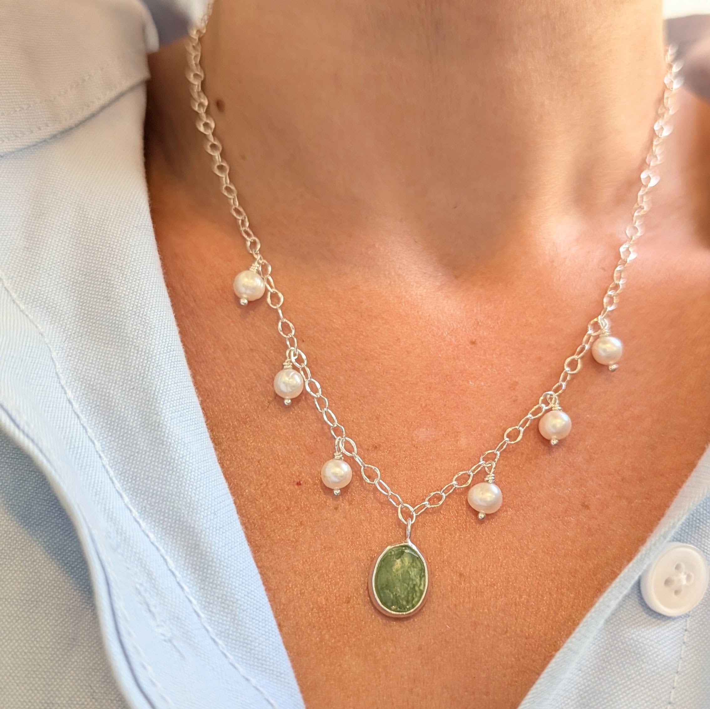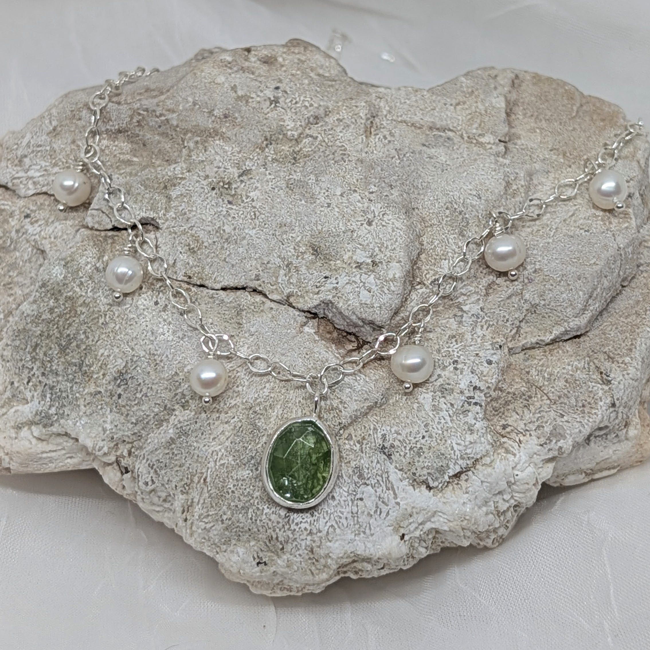 Delicate green kyanite pendant suspended gracefully at the center, surrounded by lustrous pearl beads that dance with subtle movement. This ethereal necklace captures feminine elegance through its layered design—the rich, calming green of the kyanite stone draws the eye while creamy pearls add softness and dimension. Perfect for everyday wear or special occasions, the interplay of stone and pearl creates a piece that feels both grounded and ethereal. A timeless addition to any jewelry collection.
