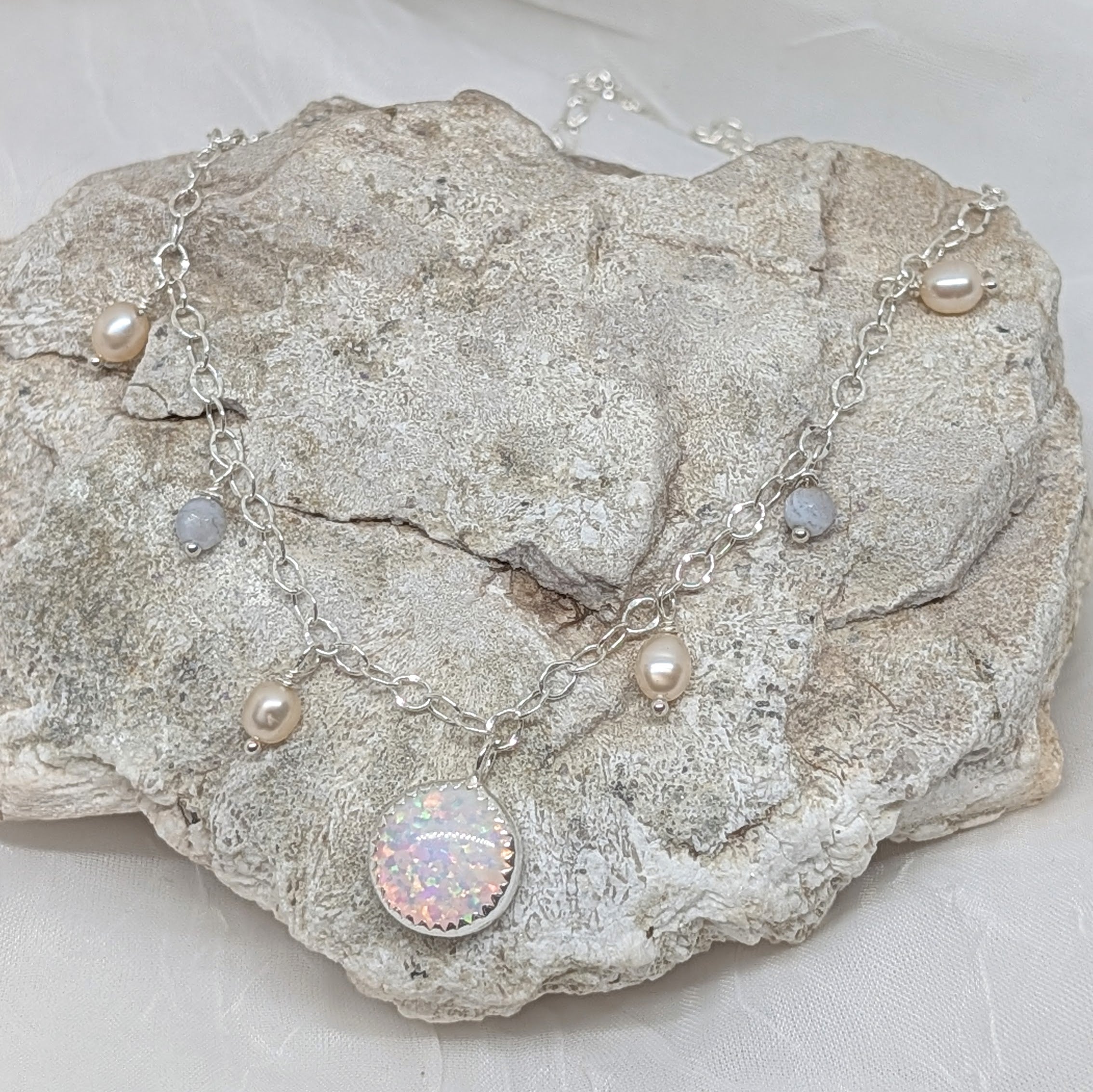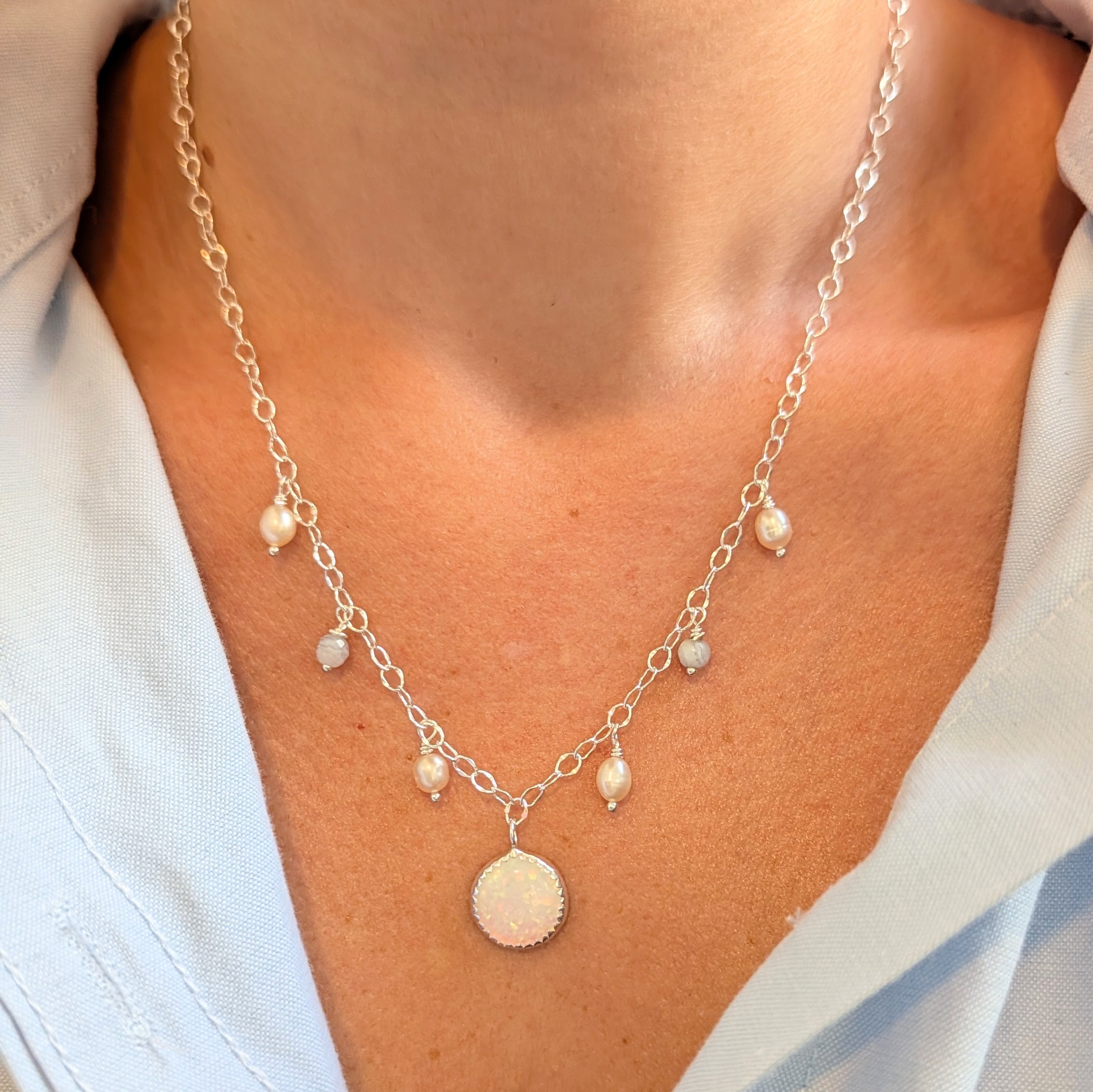 The Iris necklace features a luminous white opal pendant as its centerpiece, surrounded by delicate beads that dance gracefully along the chain. Each movement catches light, creating a shimmering play of color that shifts with every turn. The dainty design celebrates feminine elegance with its refined proportions and flowing aesthetic. Perfect for layering or wearing solo, this piece brings ethereal beauty and gentle movement to any look.
