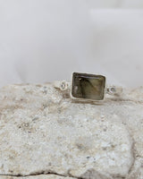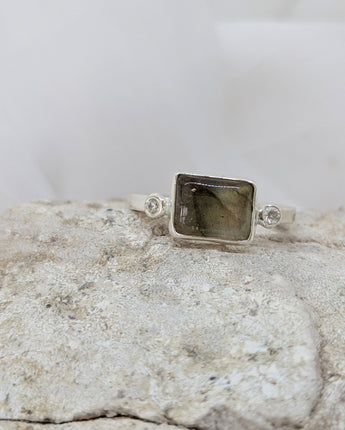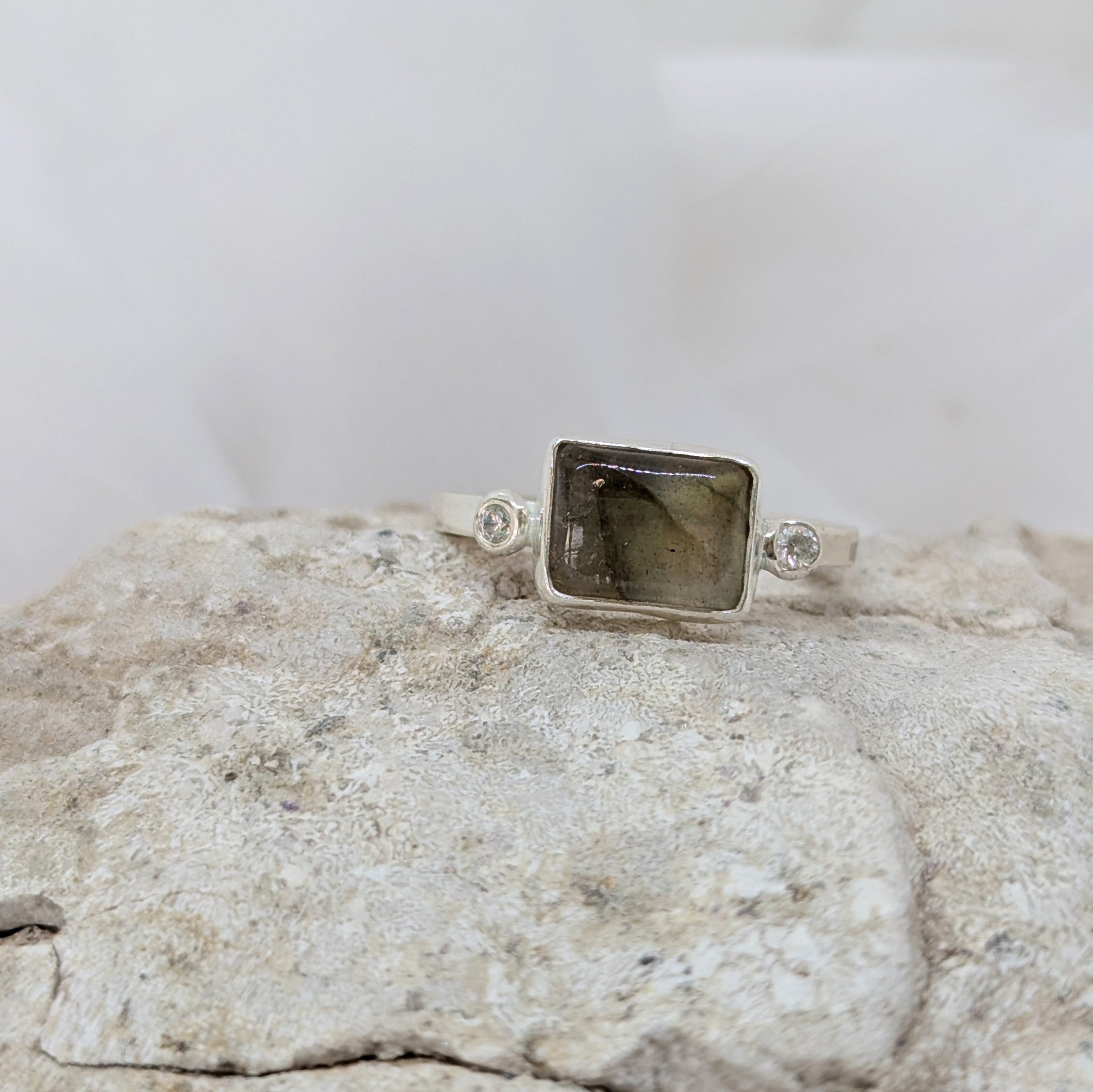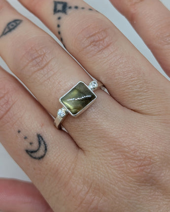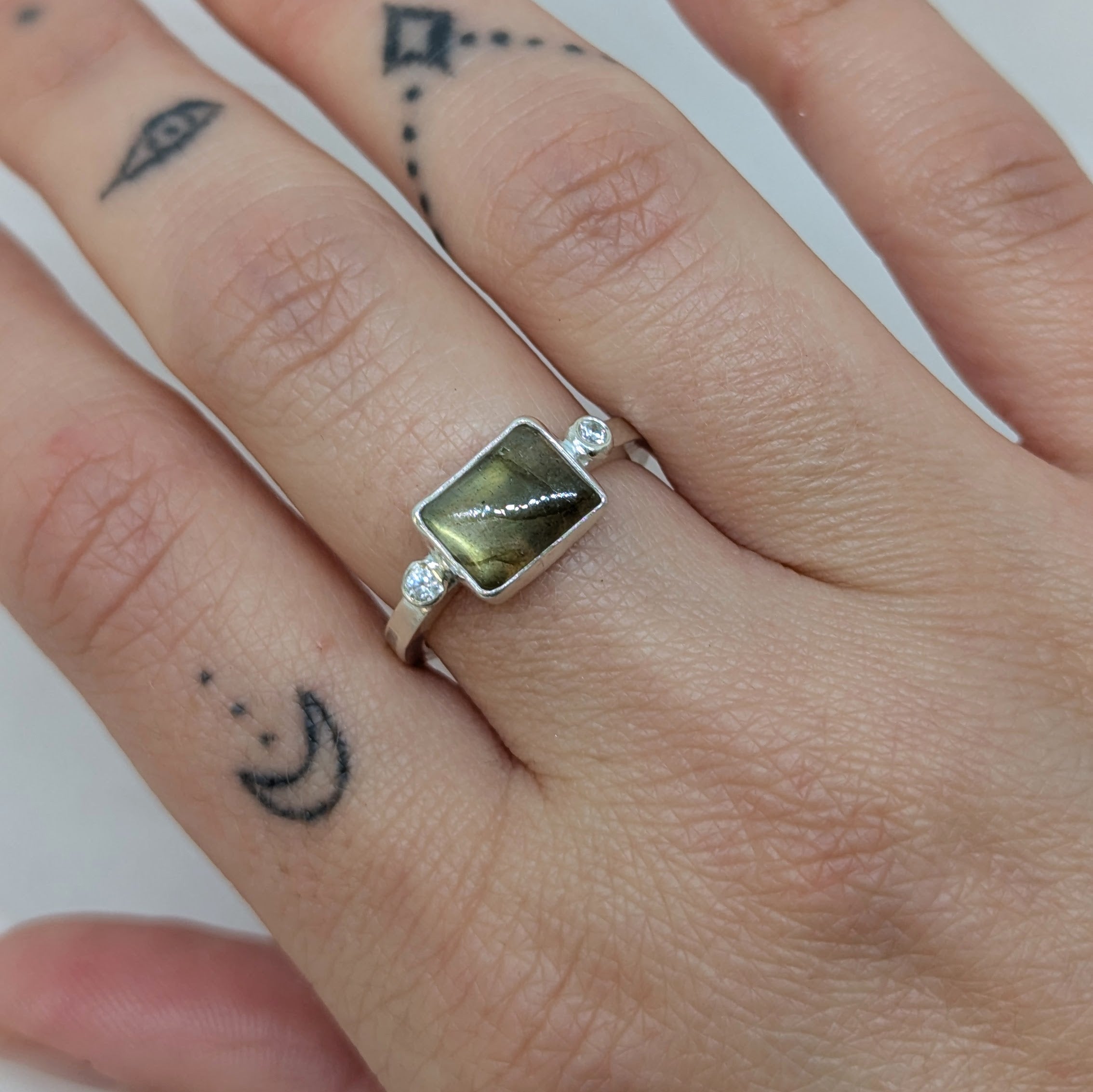 Introducing the Jane ring—a playful take on timeless elegance. This dainty beauty features a stunning olive green labradorite stone that catches the light with subtle, mesmerizing flashes, flanked by sparkling cubic zirconia accents on each side. Perfect for everyday wear or special moments. A classy choice for anyone who loves jewelry with personality.