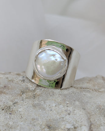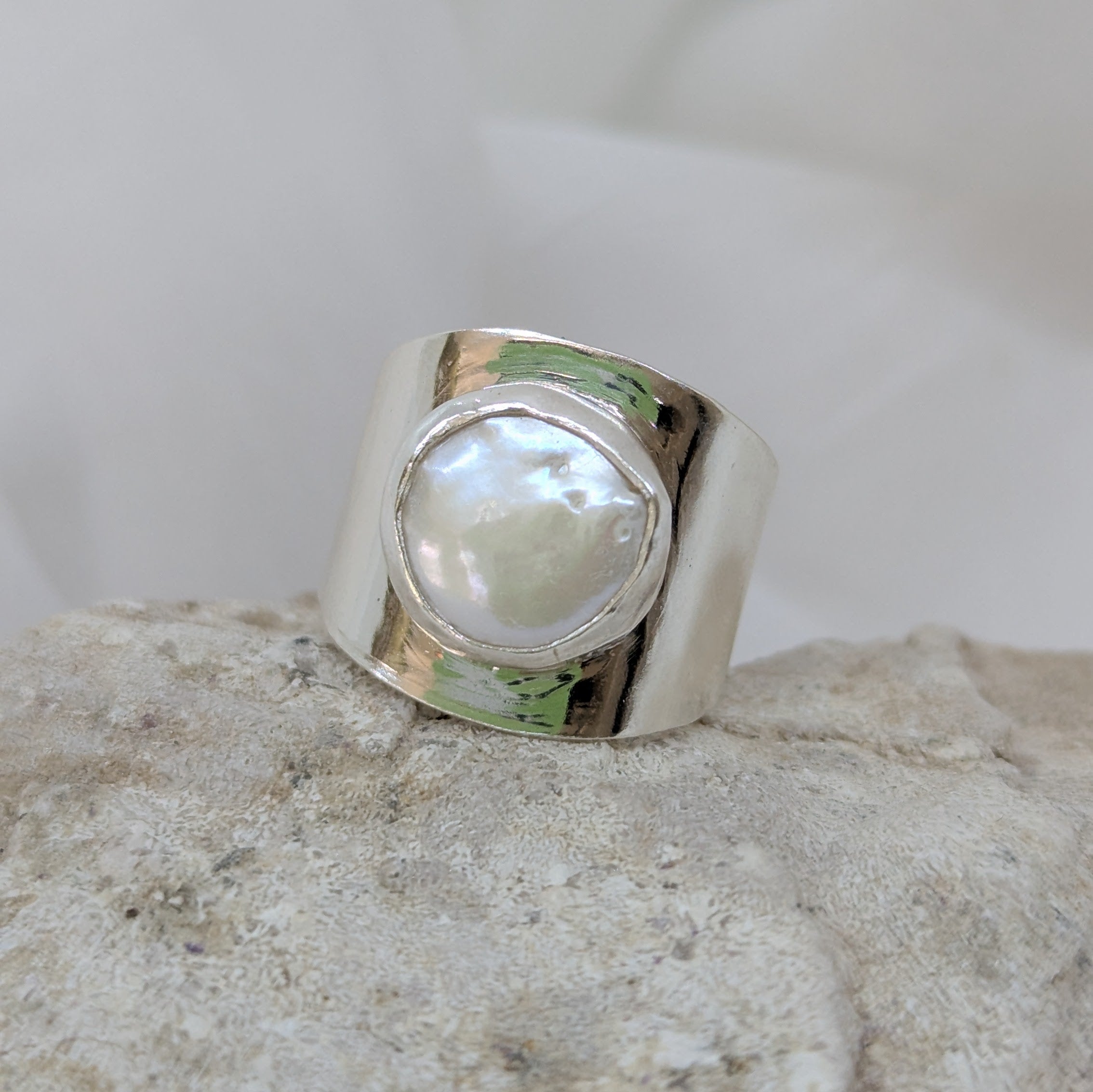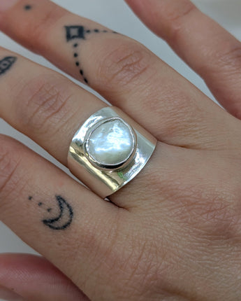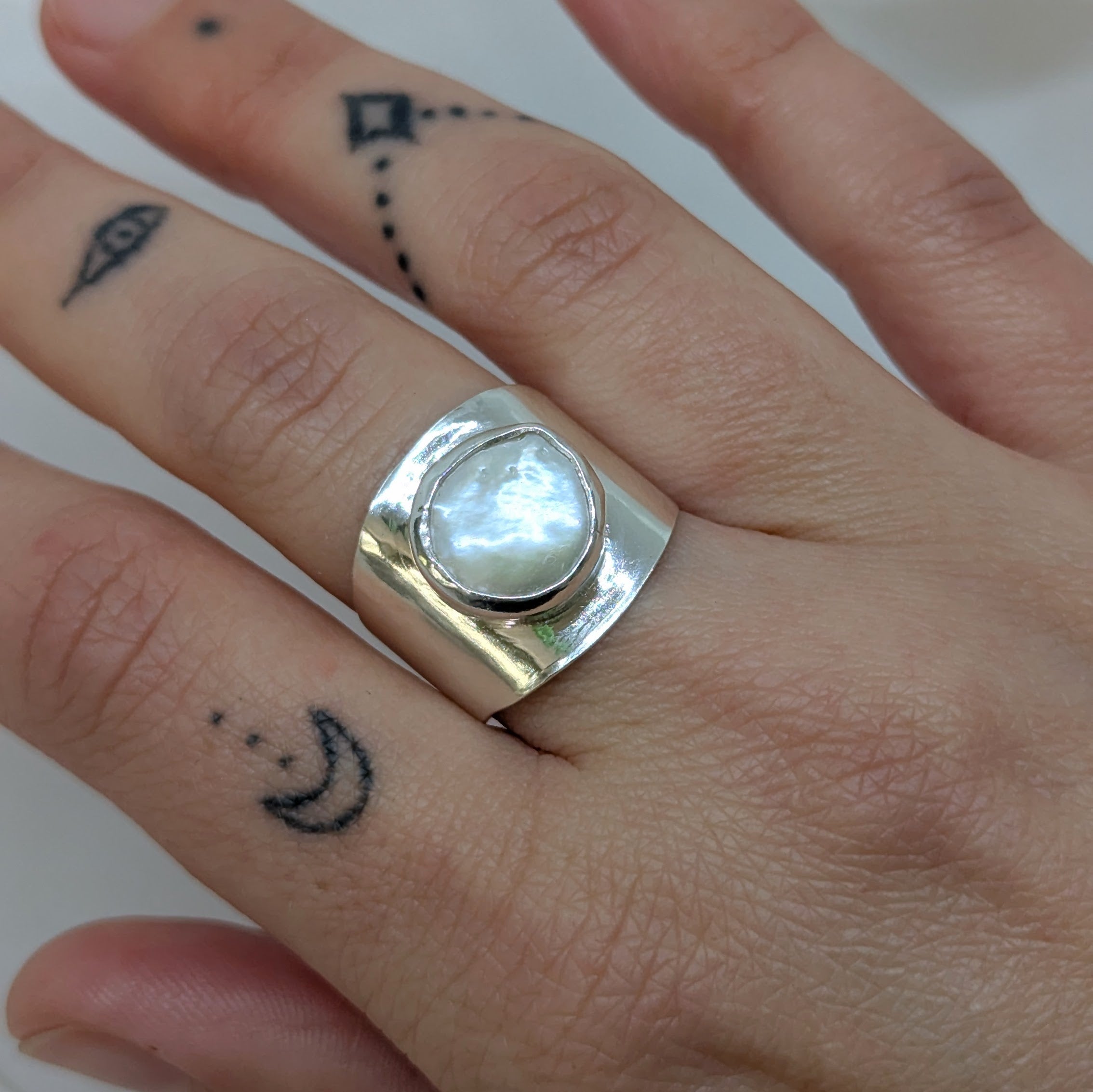 Make a statement with this bold saddle ring, where a lustrous pearl brings unexpected elegance to an oversized silhouette. The pearl's soft iridescence adds a touch of sophistication that keeps the look refined rather than over-the-top. Perfect for those who want their jewelry to command attention without sacrificing class.