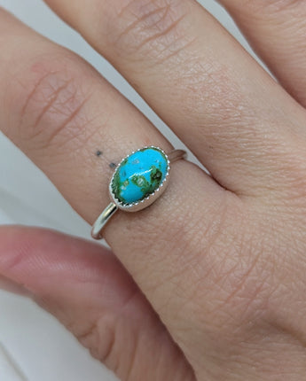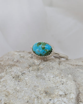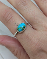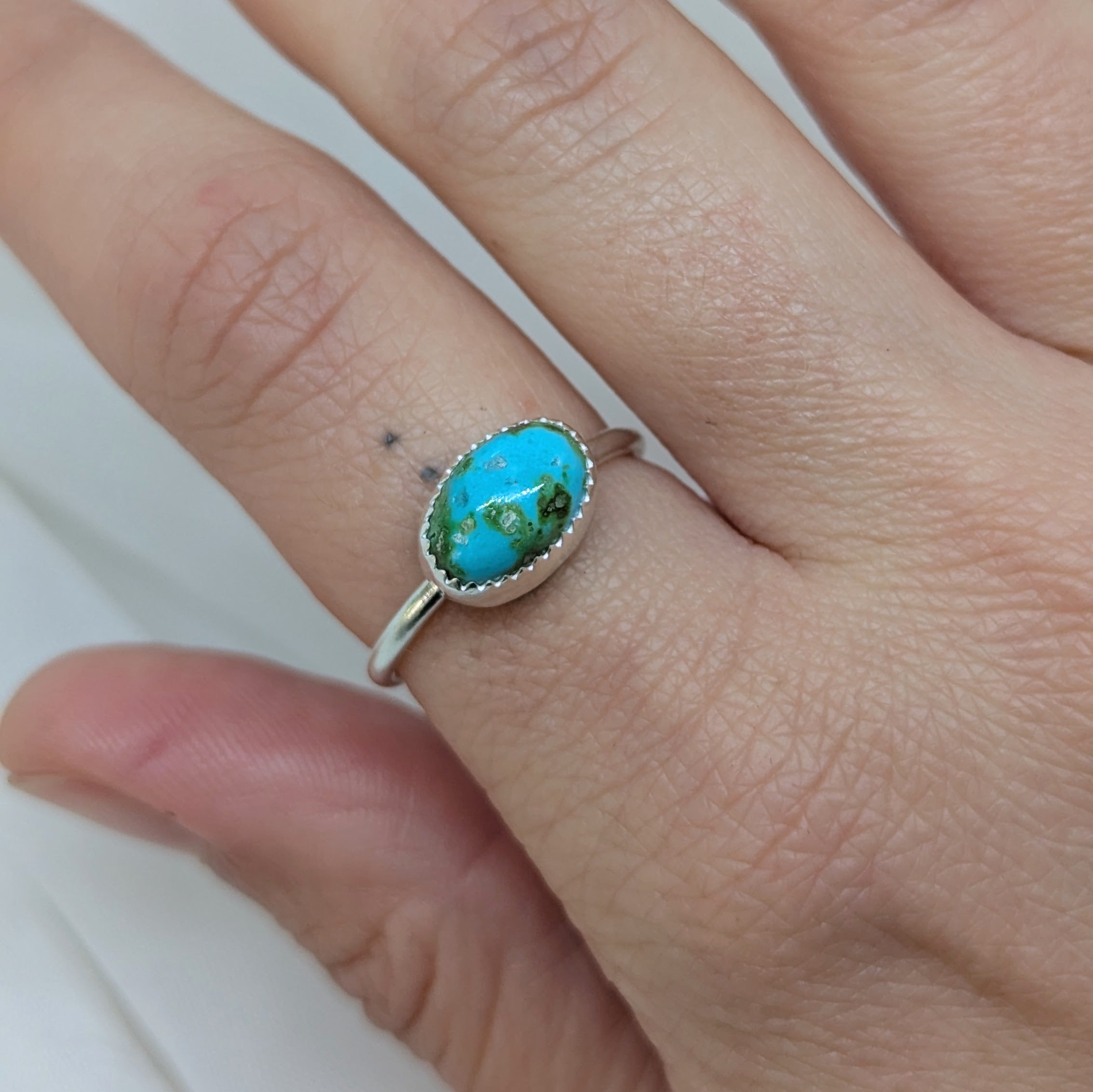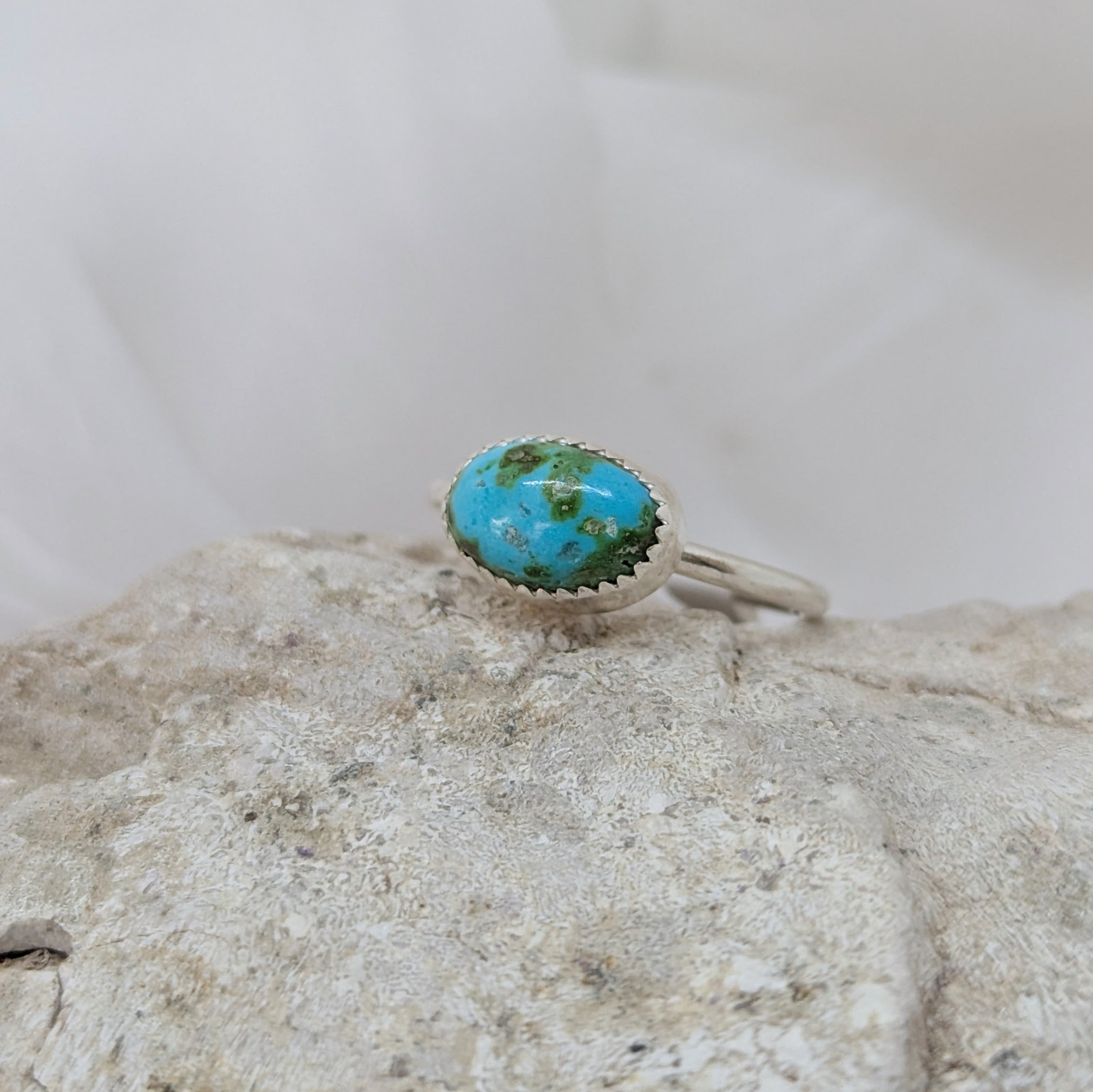 Slip on a slice of seaside bliss with this petite turquoise ring. Reminiscent of sun-kissed ocean shallows, its gentle blue tone brings instant personality to your jewelry rotation. Dainty yet bold in color, it's the perfect pick-me-up for layering or wearing solo—a playful way to keep that breezy, beachy energy close.