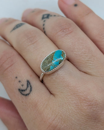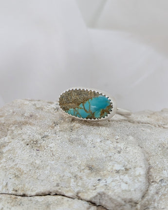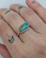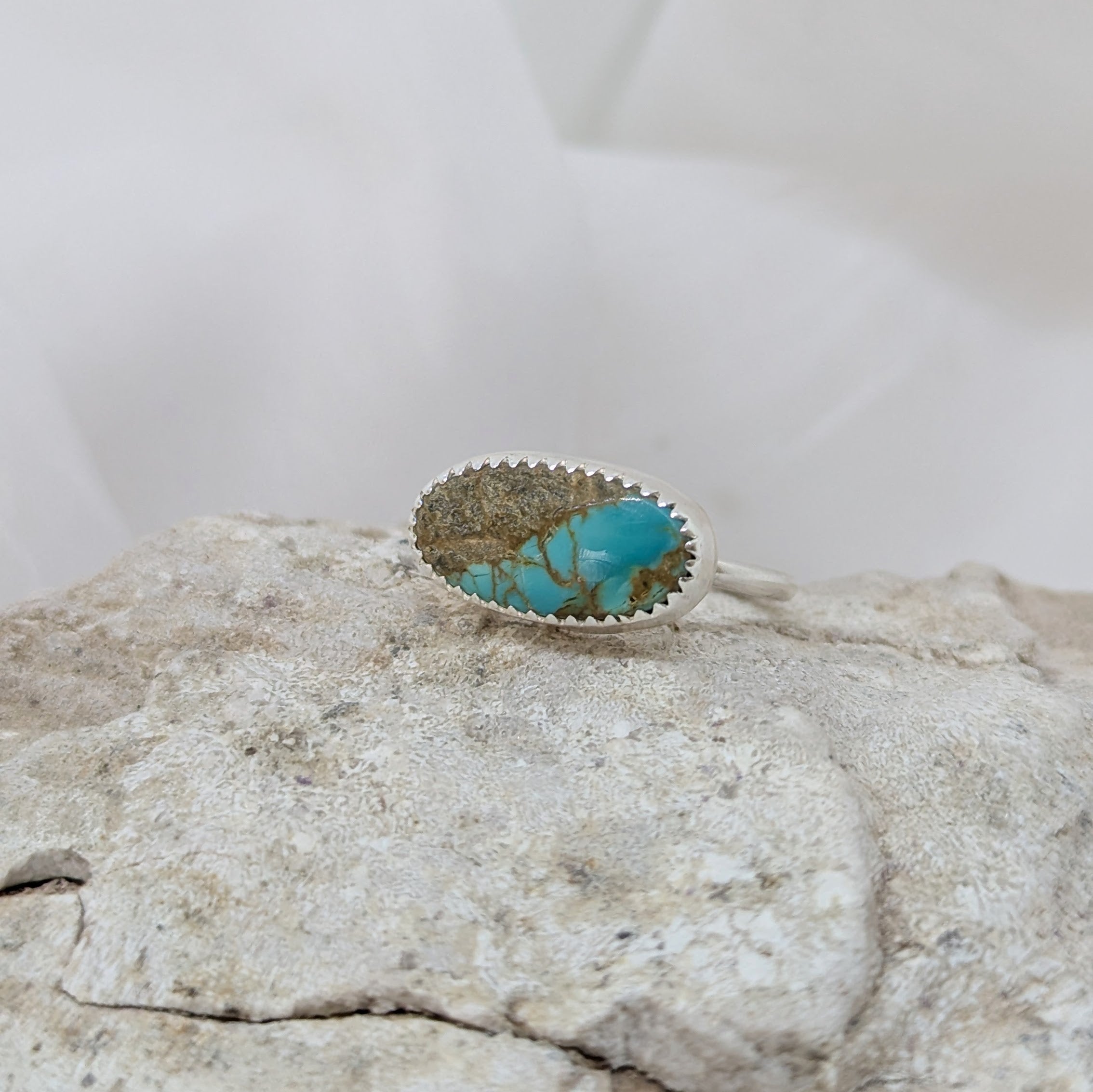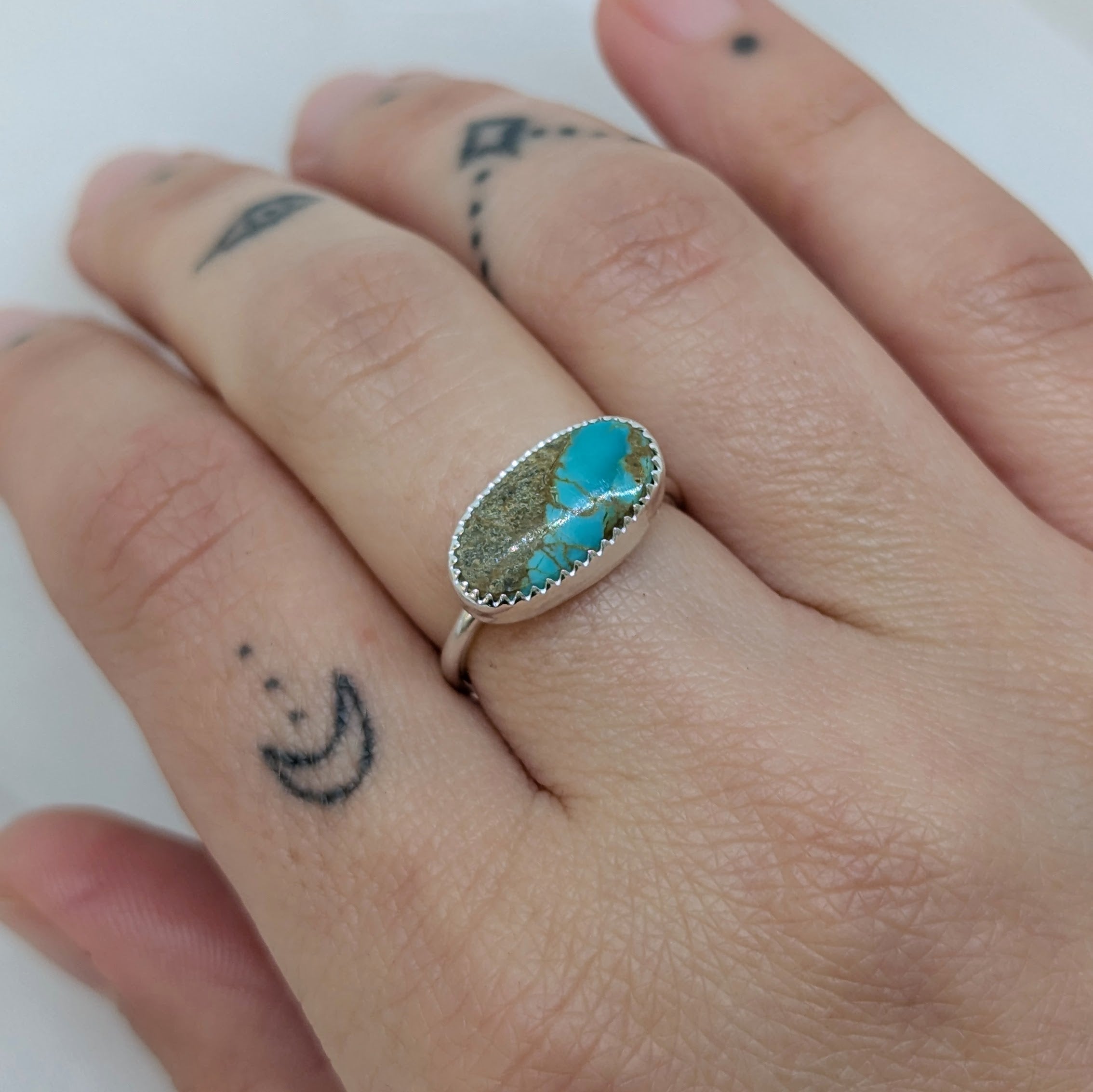 Meet your new favorite ring—a delicate turquoise stunner with moody blue and earthy brown swirls that whisper desert stories. This dainty piece channels laid-back western vibes without taking itself too seriously. Layer it, wear it solo, or let it be the conversation starter on your hand. Pure southwestern charm, zero fuss.