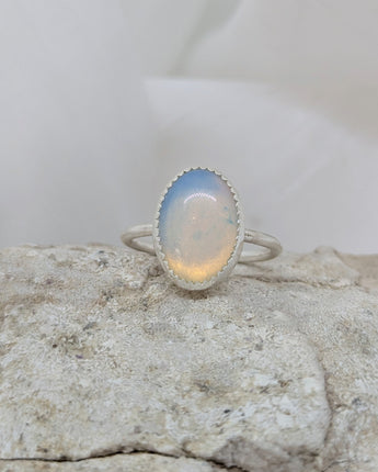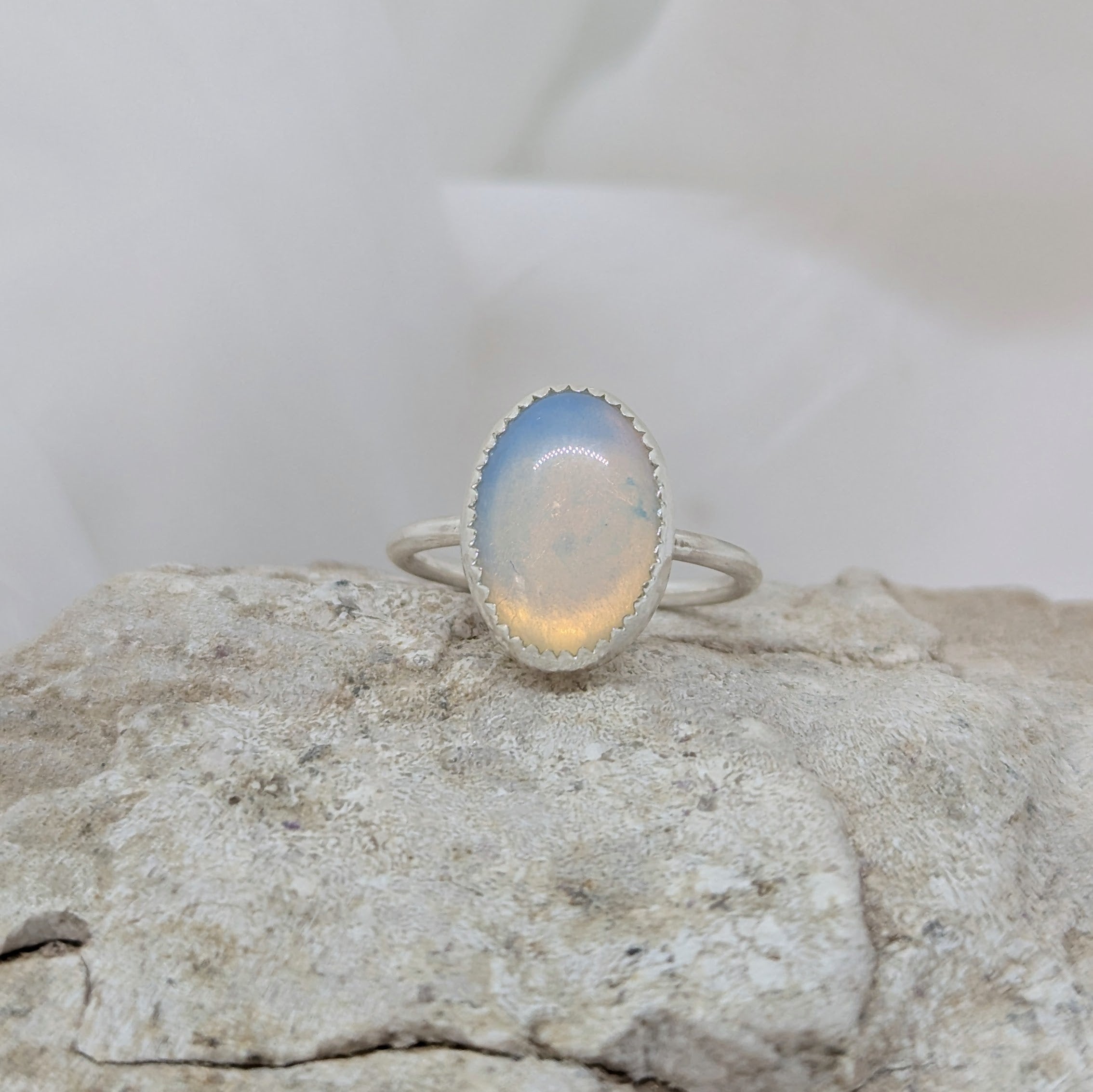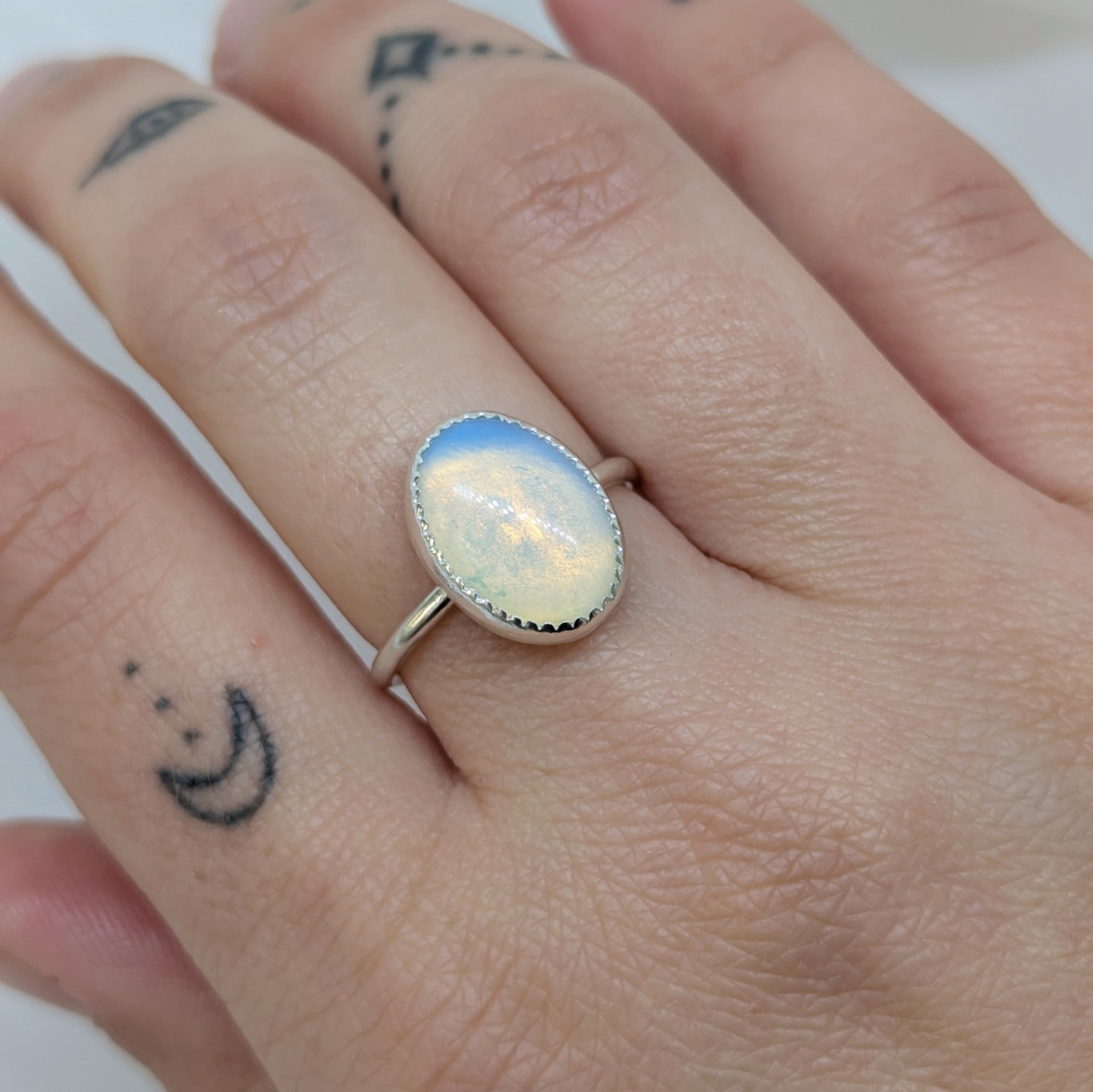 Introducing the Tylor Ring—a playful take on everyday elegance. This beauty features a stunning opalite stone that catches the light from every angle, revealing a mesmerizing dance of colors and shimmer. The simple band lets the stone steal the show, delivering just the right amount of sparkle without the fuss. Perfect for adding a touch of iridescent fun to any moment.