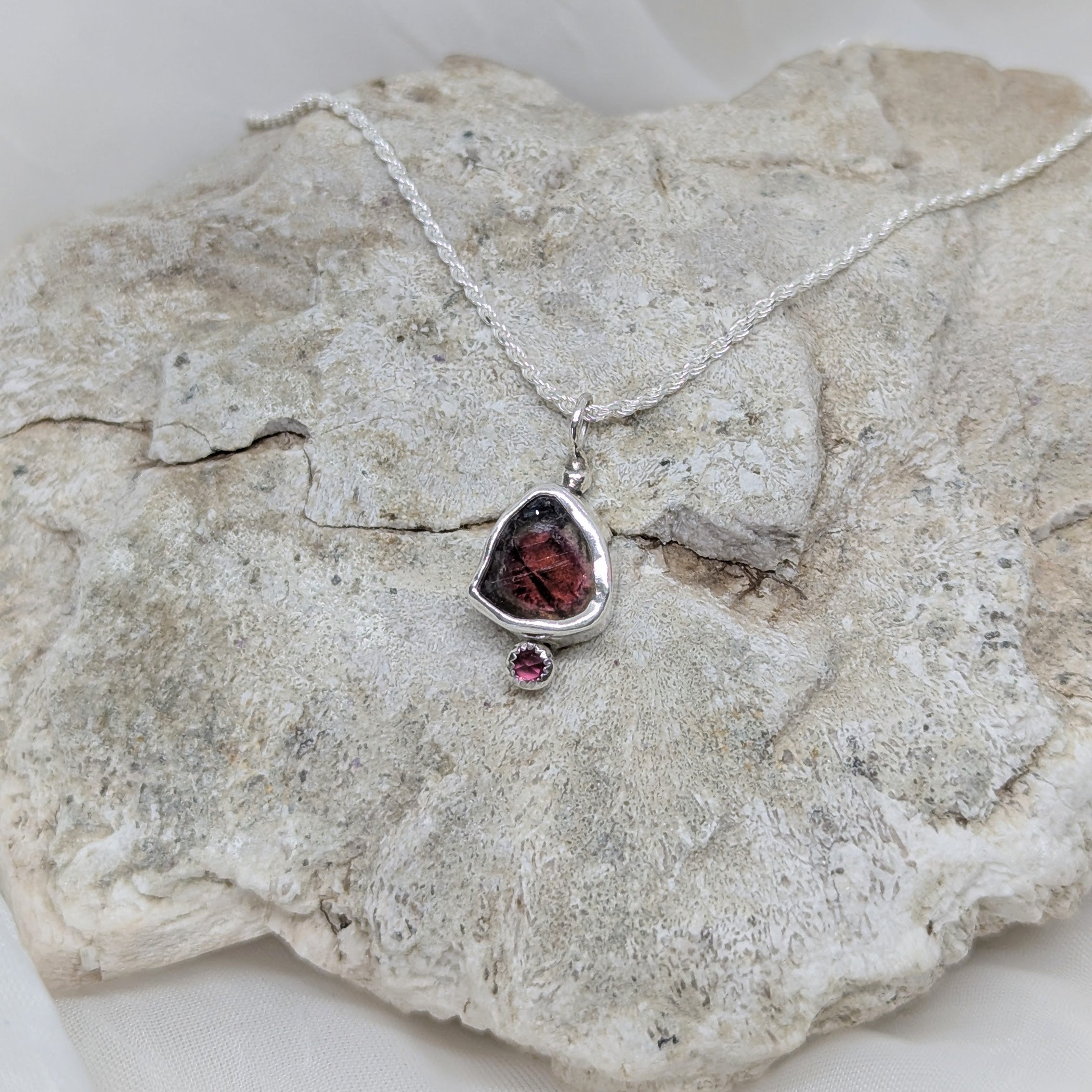 Slice into summer style with this whimsical watermelon tourmaline pendant—nature's candy in gemstone form. Paired with a delicate pink garnet accent, this necklace captures the perfect balance of playful charm and timeless elegance. A conversation starter that feels both classic and refreshingly one-of-a-kind, it's the kind of piece that makes you smile every time you catch your reflection.